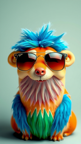 Meg's Description: image of a kawaii furry hot dog creature with nipple hair. The background should be simple and clean. The colors are Tangerine Orange, Emerald Green, Cobalt Blue. The hotdog snotnose should have a big grin on its face and should be wearing sunglasses that match the color scheme. Its body is hairy, but it has tufts of hair around its nipples.I want the creature to be the star, so dont include any other elements besides what I described.