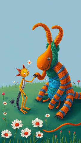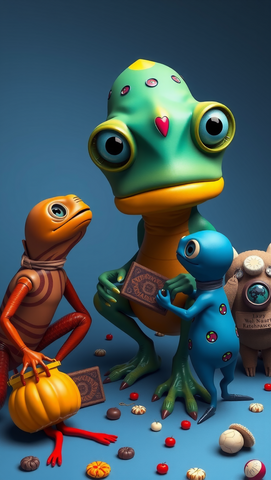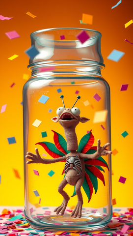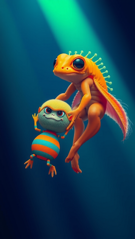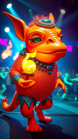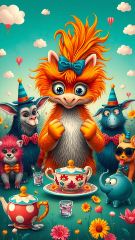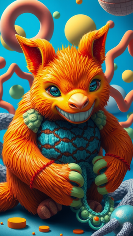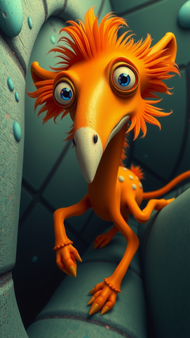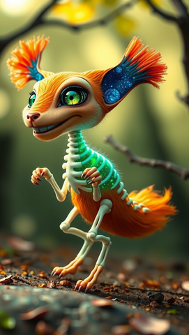 Meg's Description: A curious creature with tangerine orange fur,Emerald eyes that sparkle and gleam.Cobalt blue tassels sprout from each ear,Snuffling, squeaking, dancing through the scene.Farcical and silly this critter appears,Flaunting its hues to attract a mate.In the forest glade it frolics with glee,The Snarfsqueekers antics never abate.Sparkle-bone skeleton shines from within,A magical creature, both strange and divine. Behold the Tassled Snarfsqueeker in all its might!An absurd wonder to behold with eyes bright!Prompt: Sparkle bone tassled snarfsqueeker creature with tangerine orange fur, emerald green sparkly eyes and cobalt blue ear tassels. Silly farcical expression, dancing pose. Magic sparkle-bone skeleton visible beneath translucent skin. Forest glade background.