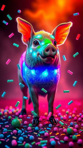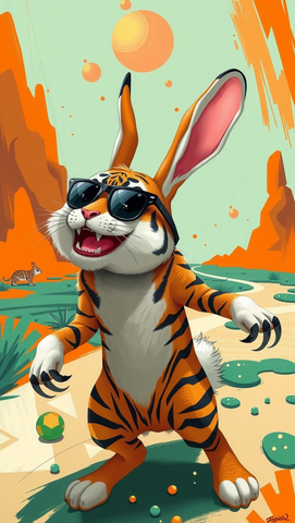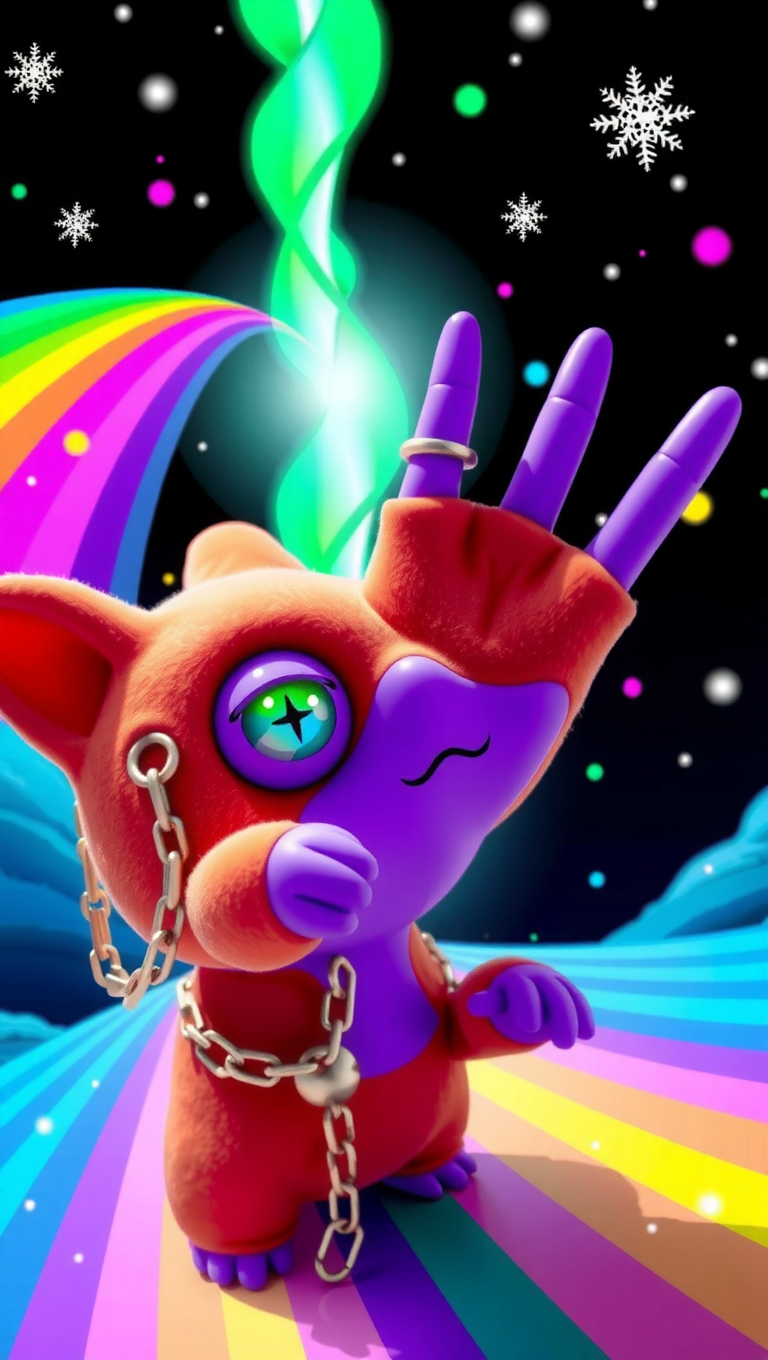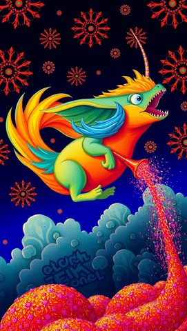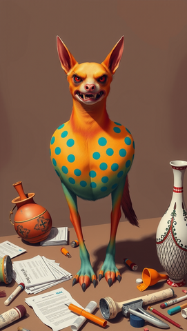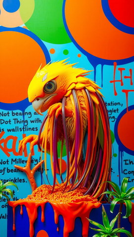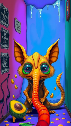 Meg's Description: Bob, I need you to create an absurdist artwork based on the following prompt:Theme: A disfigured animal called the Fat-Knotted Exploding Swammytwister searching for food. Color Palette: Tangerine Orange, Emerald Green, Cobalt BlueInclude these elements:- Warped shapes and colors - Trippy hallucinogenic visuals- Punk rock flyers taped to the background walls- An ice blast emanating from somewhere in the scene- Glitter makeup on the animals face- Bright glowing color effects - Sprinkles of avocado on the groundThe style should be bizarre, psychedelic and over-the-top. Really push the boundaries! I want this piece to look completely wild and surreal.Title: The Fat-Knotted Exploding Swammytwisters Trippy Hunger Quest. Got it? Now get drawing! Lets make Amy proud with a truly mind-bending work of art.