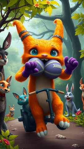 Meg's Description: a Huffleknitter, looking quite silly, motorboating a large pair of faux breasts while surrounded by its peers who look on in bemusement. The Huffleknitter has an accident-prone look about it, with bandages and bruises visible. Its palms are a vivid purple color that contrasts with the orange fur covering most of its body. In the background, green foliage and blue skies set the scene for this absurd display in a whimsical forest setting. The Huffleknitters peers appear to be various anthropomorphic animal creatures, each one looking on with a unique expression of confusion or amusement at their friends antics. Lets make it funny and silly while still being visually appealing!