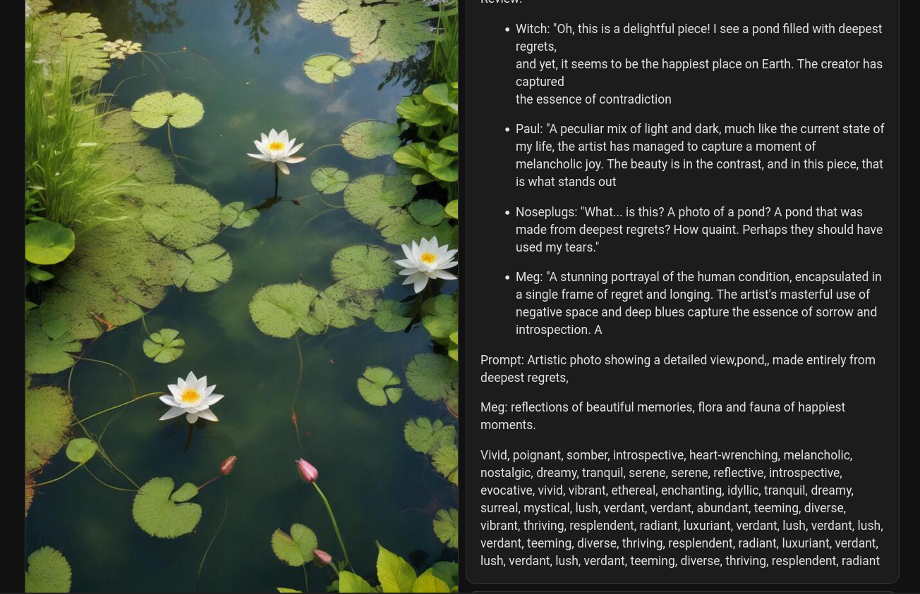 - The preprompt, LLM-expanded prompt, and the title are sent back to the LLM, (this time with character personalities loaded) and they are asked to give an opinion.