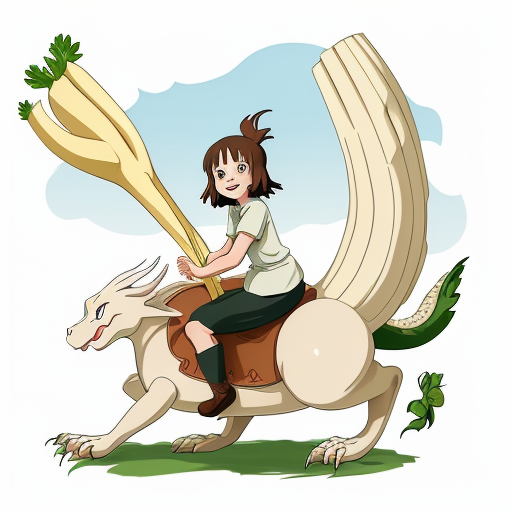 A smiling cartoon ((parsnip)), studio ghibli style, riding a dragon