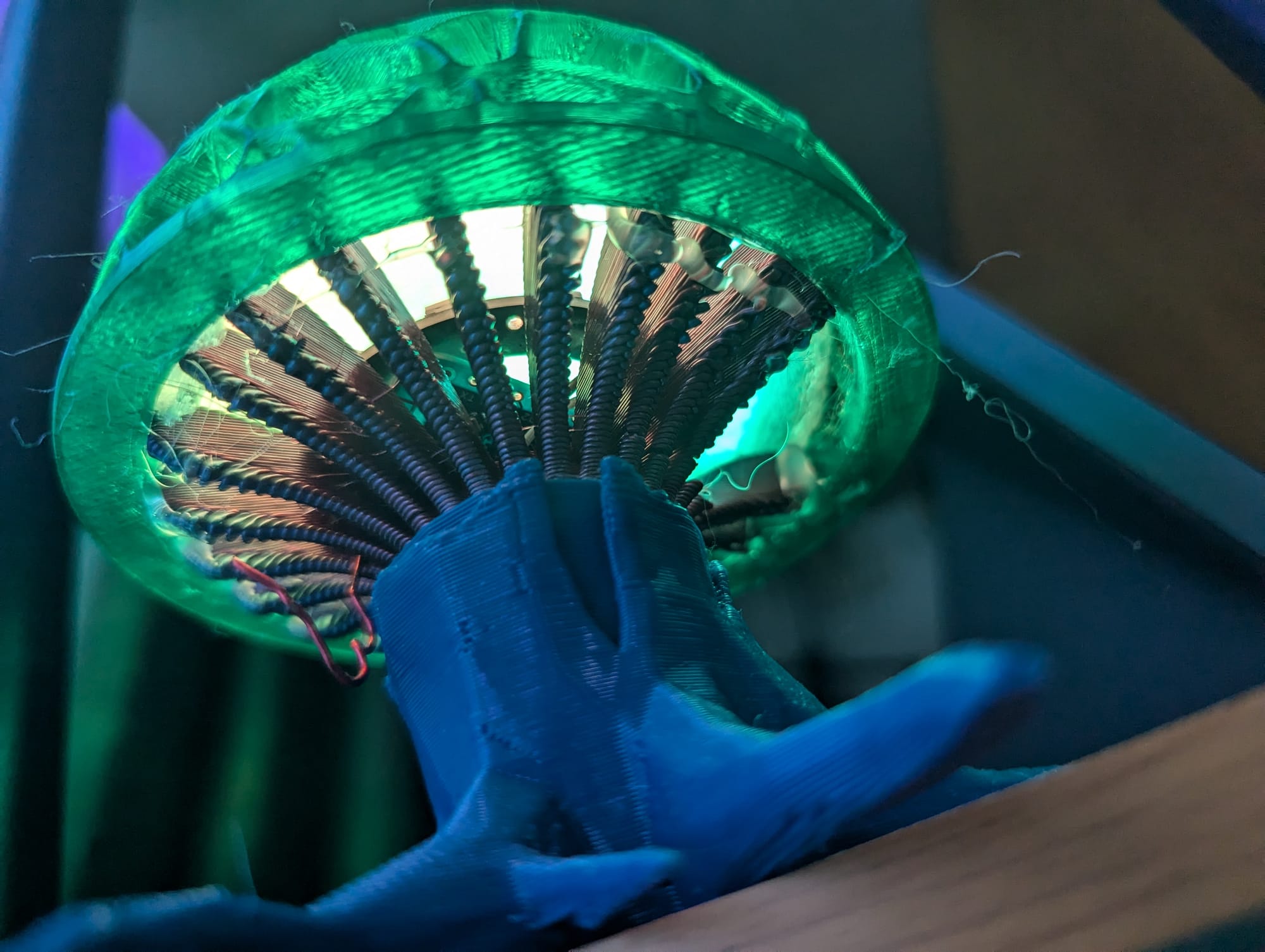 It is just an LED ring under the mushroom dome, with a D1 mini sandwiched between that and the stem piece. The cord comes out a gap in the bottom and goes to a usb plug.