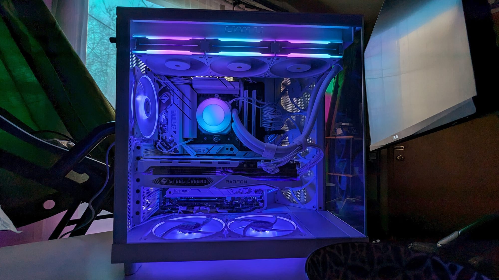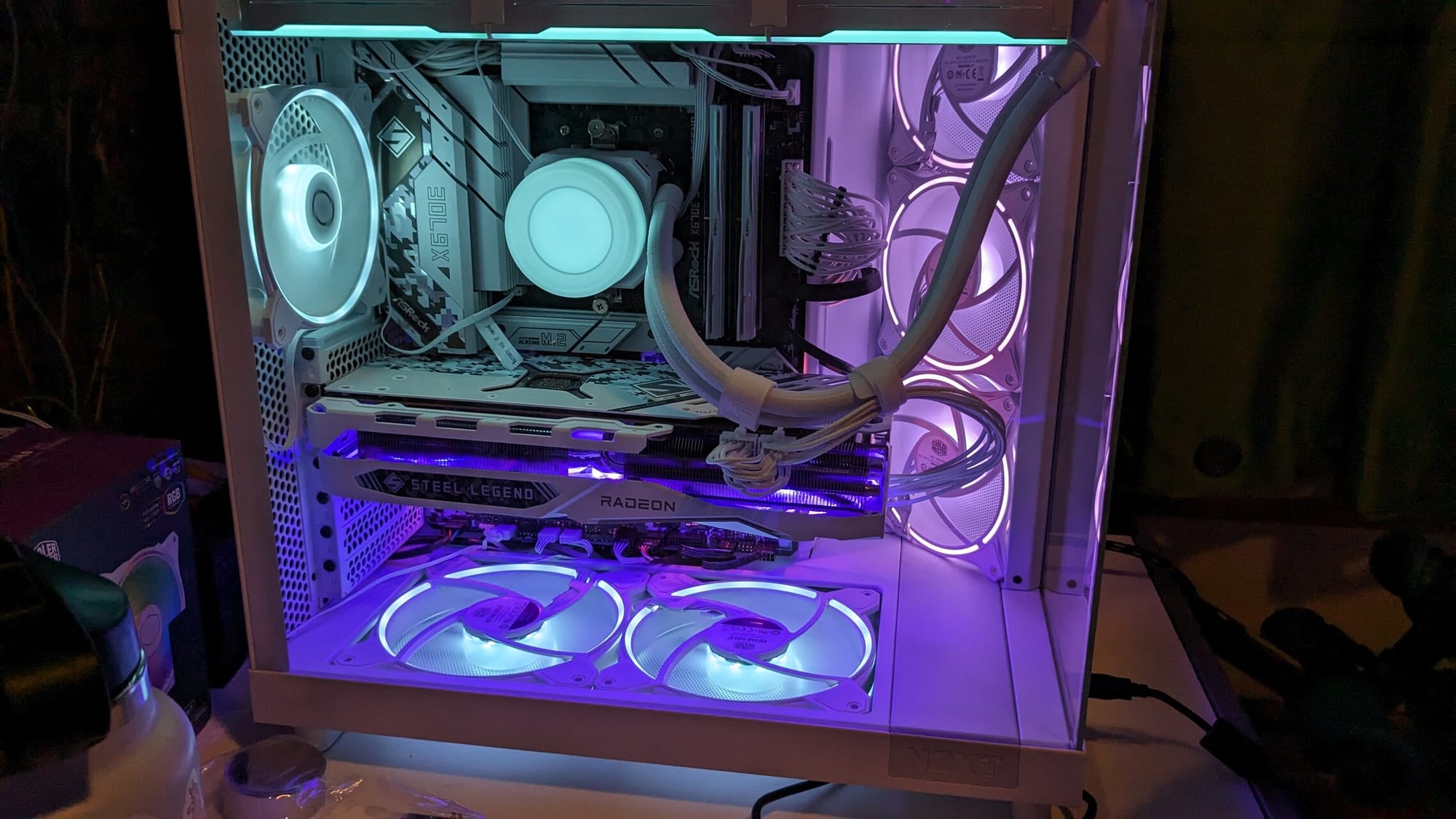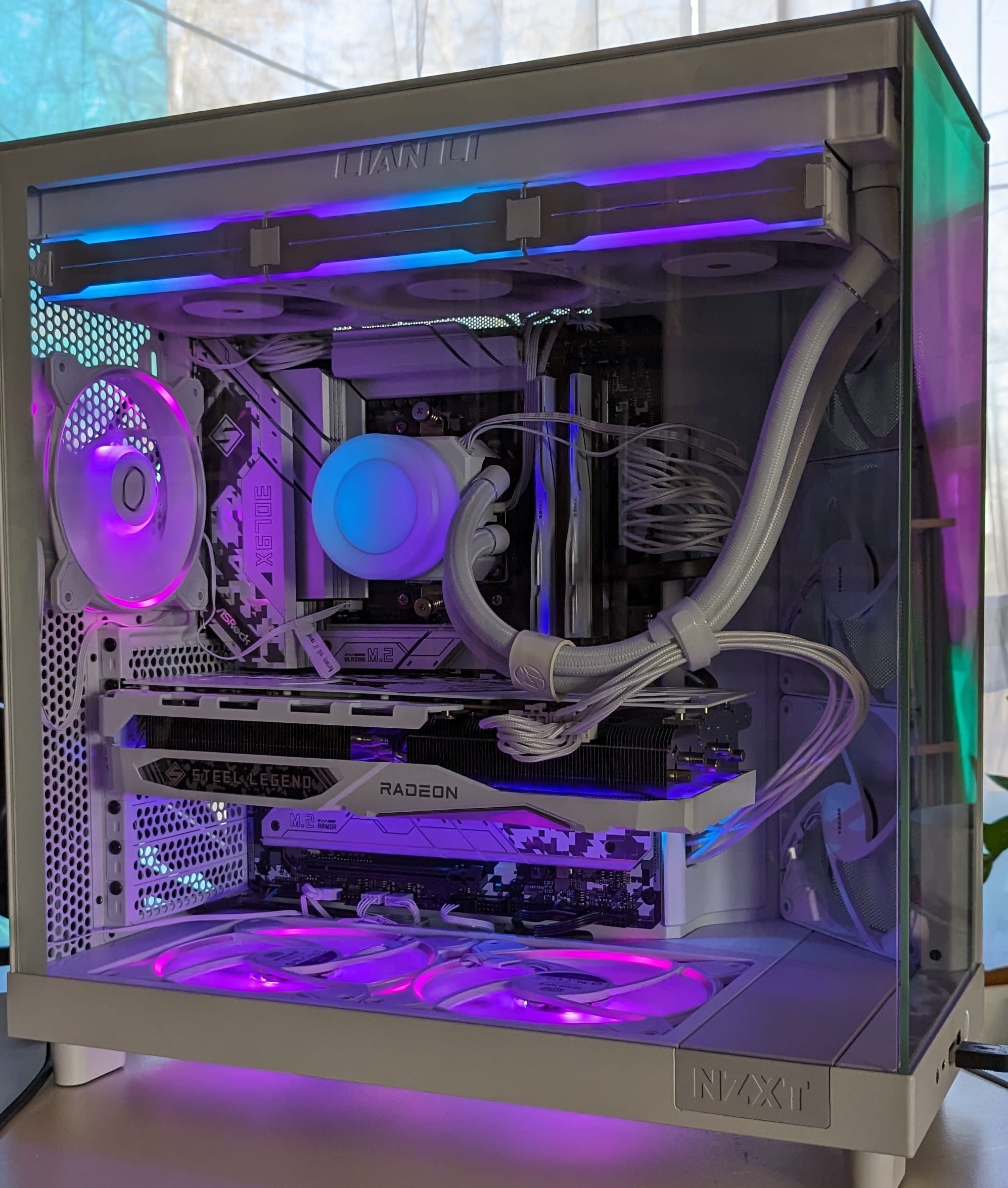 Oddly, I decided on white parts this time. I called it Nebula in my head at one point, and it stuck, so "her" name is Nebula. An ASRock X670E Steel Legend ATX AM5 Motherboard and an ASRock Steel Legend OC Radeon RX 7800 XT 16 GB Video Card - lots of ARGB on just those 2 pieces! White case (NZXT H6 Flow), white fans (Cooler Master Halo^2 4x MF120s and 2x MF140s), white cooler (Lian-Li Galahad II Trinity Performance 360 AIO with their Side-ARGB Kit), white power supply (ROG 850 80+ gold), white/argb RAM (GSkill), and the motherboard and video card are both like a white/black digital camo thing. (Getting all of my leds to talk to the same program was an adventure that I definitely needed help with (Thank you, Zen!).) Oh, and like 4Tb of nvme storage. Baulder's Gate 3 was my first big install (after my Ninite package, anyhow).