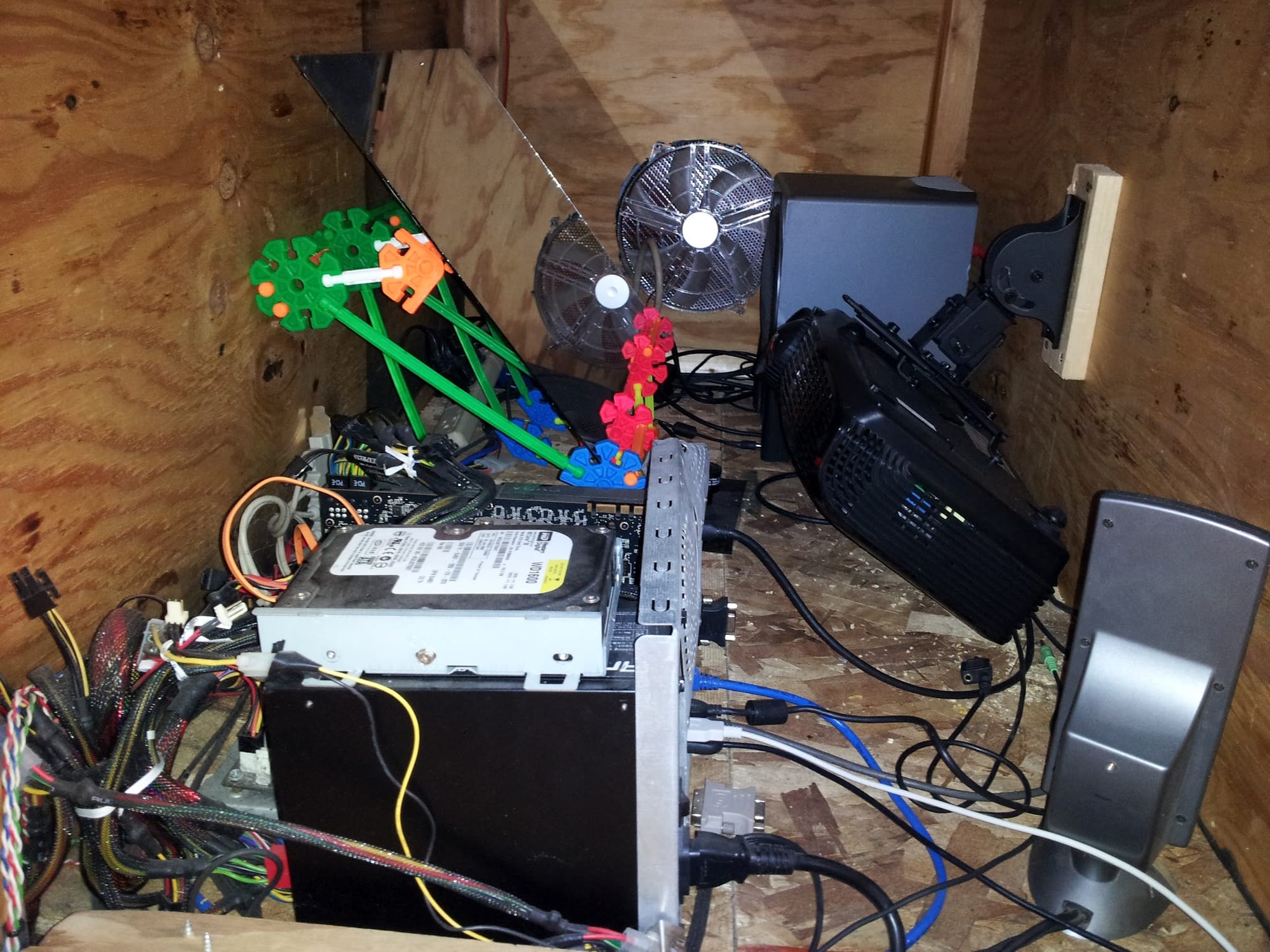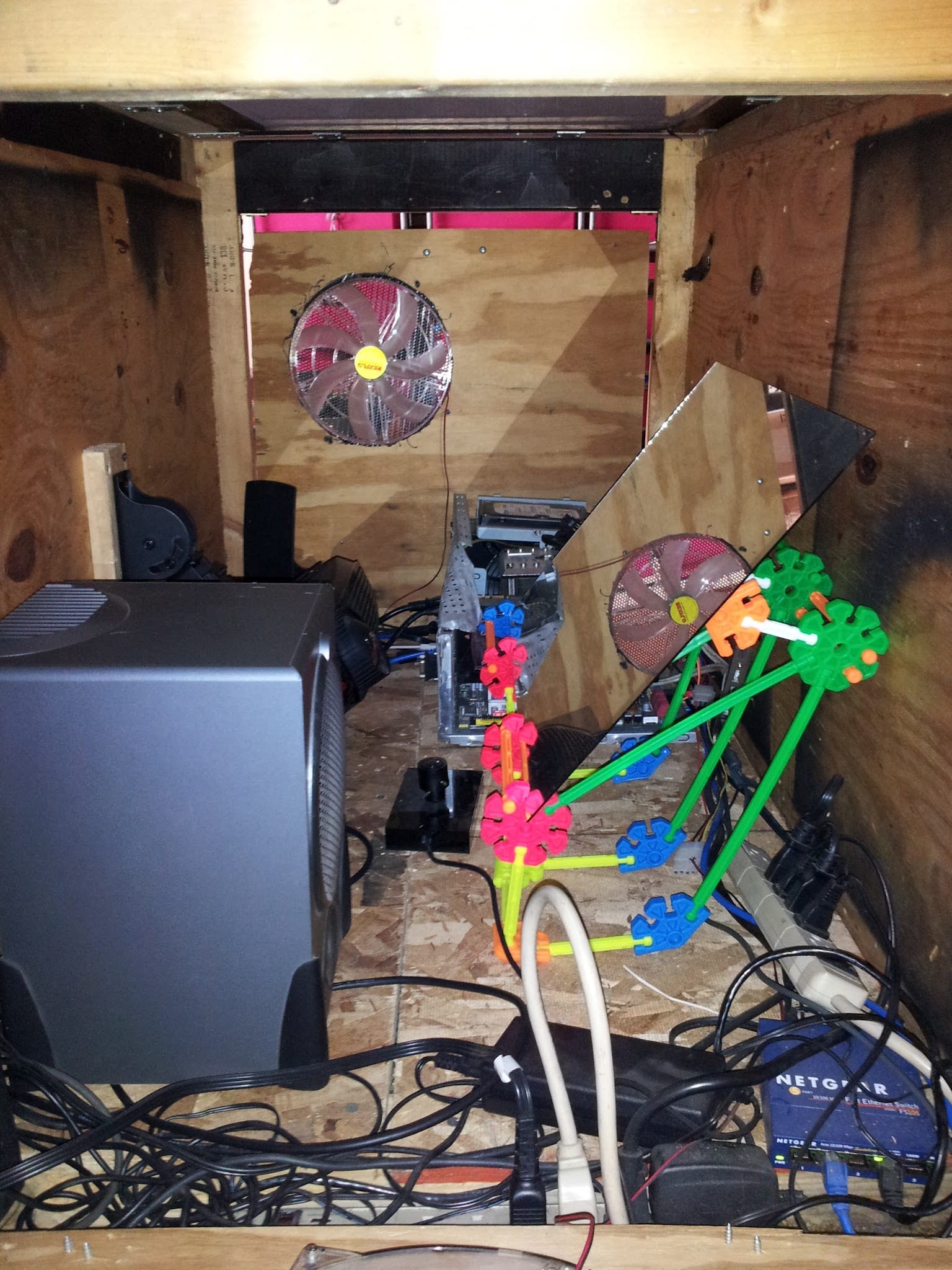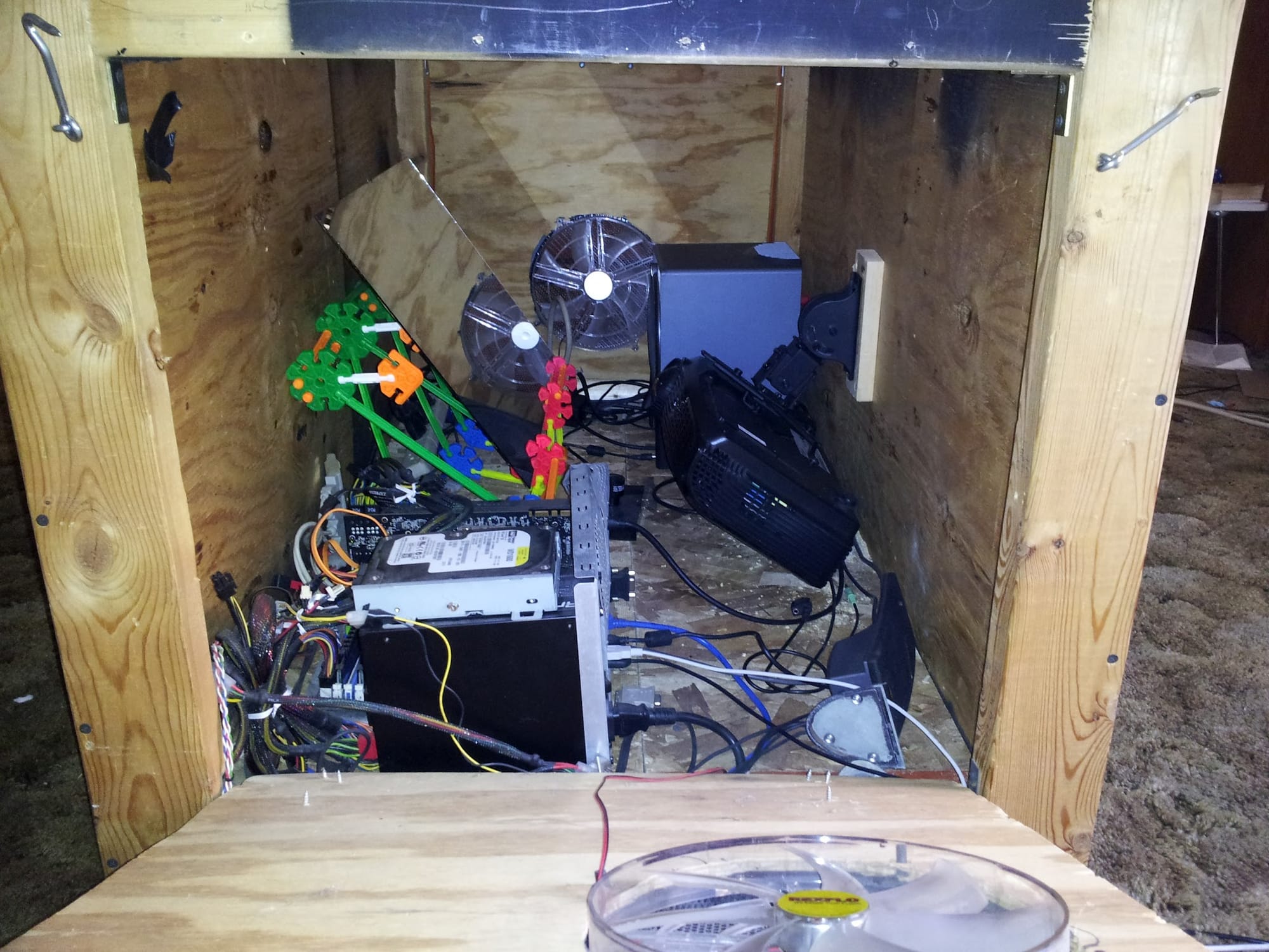 Between the projector and the PC, I was worried about heat down there, hence the giant fans. They were pretty quiet, and moved a reasonable amount of air. Intake on one side, exhaust on the other. It was a decent plan, but it turned out to not matter much. The volume of air inside of this box was so large, the projector and PC hardly affected it.
