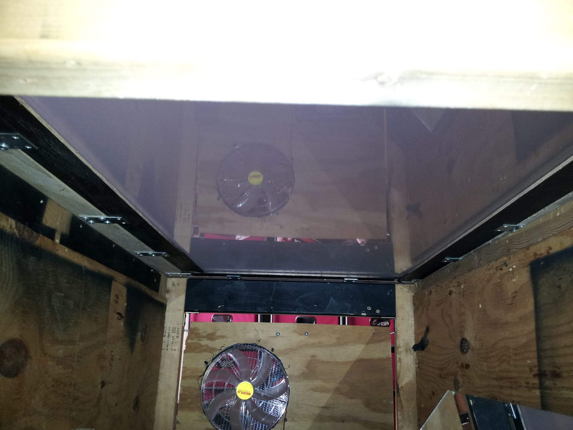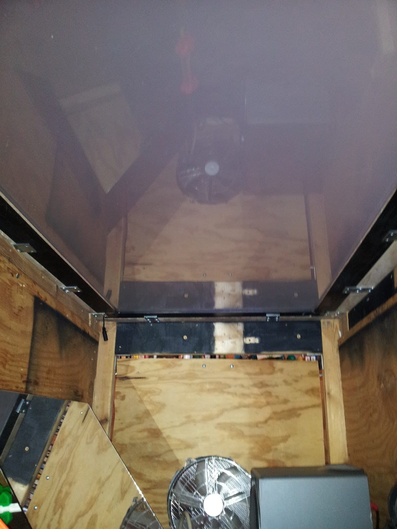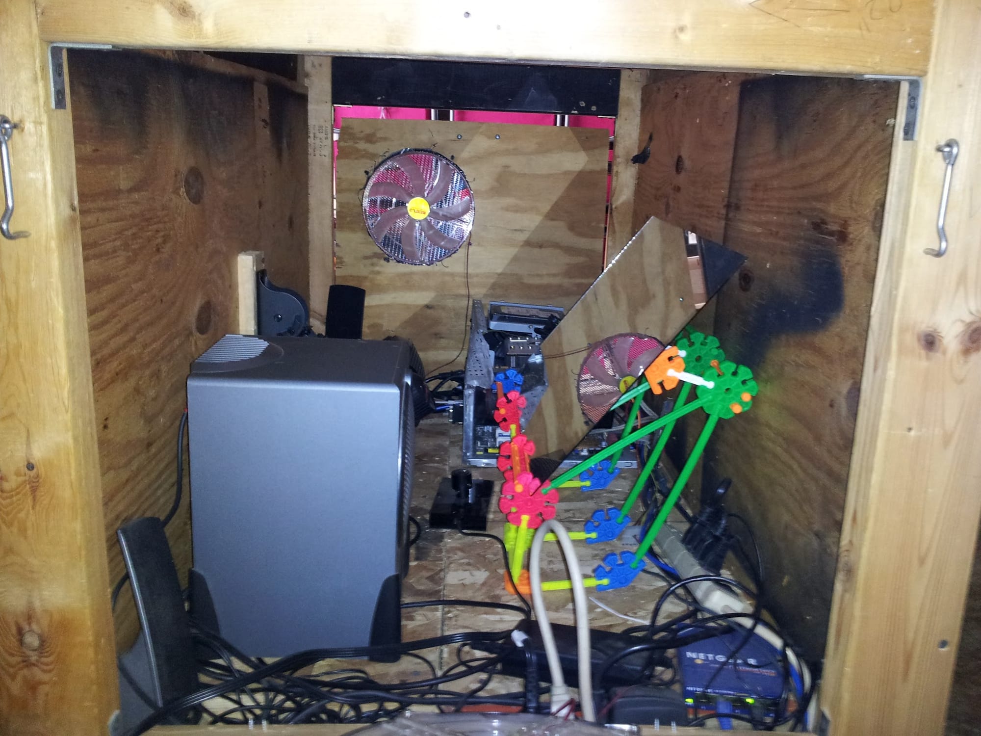 Between the projector and the PC, I was worried about heat down there, hence the giant fans. They were pretty quiet, and moved a reasonable amount of air. Intake on one side, exhaust on the other. It was a decent plan, but it turned out to not matter much. The volume of air inside of this box was so large, the projector and PC hardly affected it.